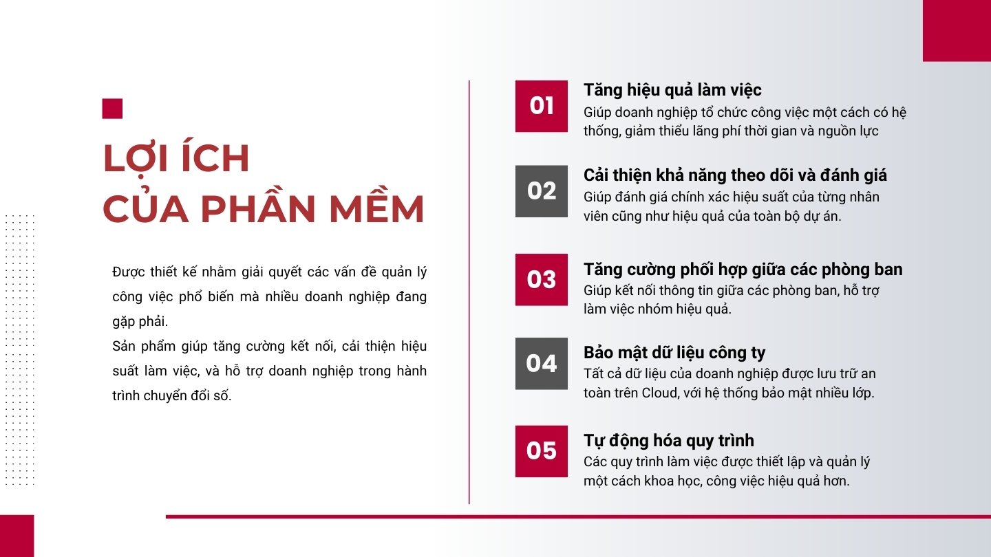Phần mềm được thiết kế nhằm giải quyết các vấn đề quản lý công việc phổ biến mà nhiều doanh nghiệp đang gặp phải. Sản phẩm giúp tăng cường kết nối, cải thiện hiệu suất làm việc, và hỗ trợ doanh nghiệp trong hành trình chuyển đổi số - một trong những yếu tố quan trọng trong thời đại công nghệ 4.0.
