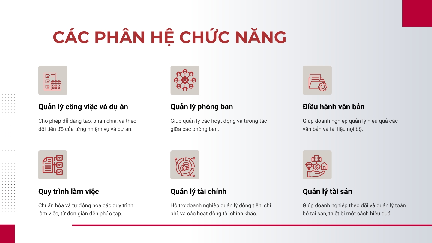 Đây không chỉ là một hệ thống phần mềm giúp quản lý công việc, dự án và hồ sơ tài liệu, mà còn là một công cụ điều hành và quản lý văn bản chuyên nghiệp, hỗ trợ doanh nghiệp thực hiện công việc một cách hiệu quả và nhất quán.