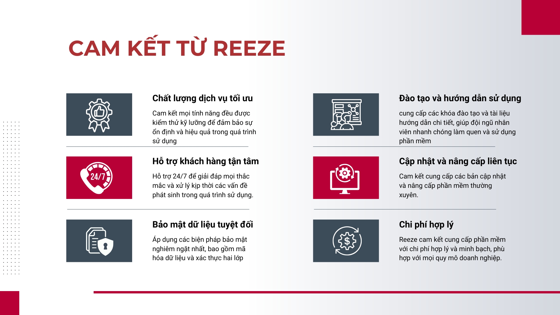 Reeze cam kết cung cấp phần mềm quản lý công việc với chất lượng vượt trội, được phát triển dựa trên các tiêu chuẩn công nghệ tiên tiến nhất hiện nay. Mọi tính năng đều được kiểm thử kỹ lưỡng để đảm bảo sự ổn định và hiệu quả trong quá trình sử dụng, giúp doanh nghiệp của bạn vận hành một cách mượt mà và hiệu quả nhất.